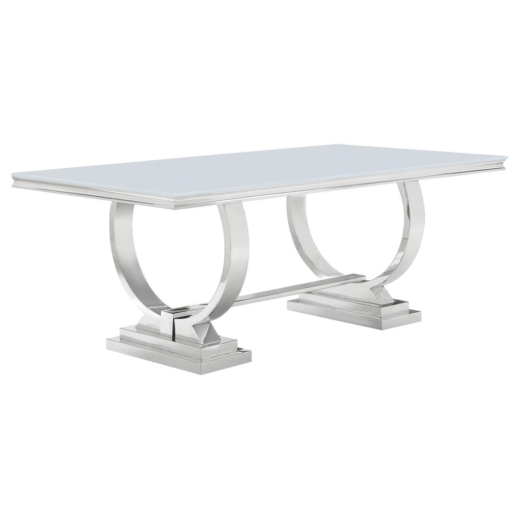 Create an opulent air of sophistication with this elegant dining table. A long and spacious tabletop seats six guests rather comfortably. Slide up a chair beneath its opaque white tempered glass surface for formal dinners and casual gatherings. Supporting the tabletop is a trestle-inspired stainless steel base with ring-shaped end supports, all of which boast a gleaming chrome finish that reflects the dining room's color palette like a chic mirror. Available within this same collection are a delicate light pink and grey slipper style dining chairs, accenting the exquisite nature of the table even further.