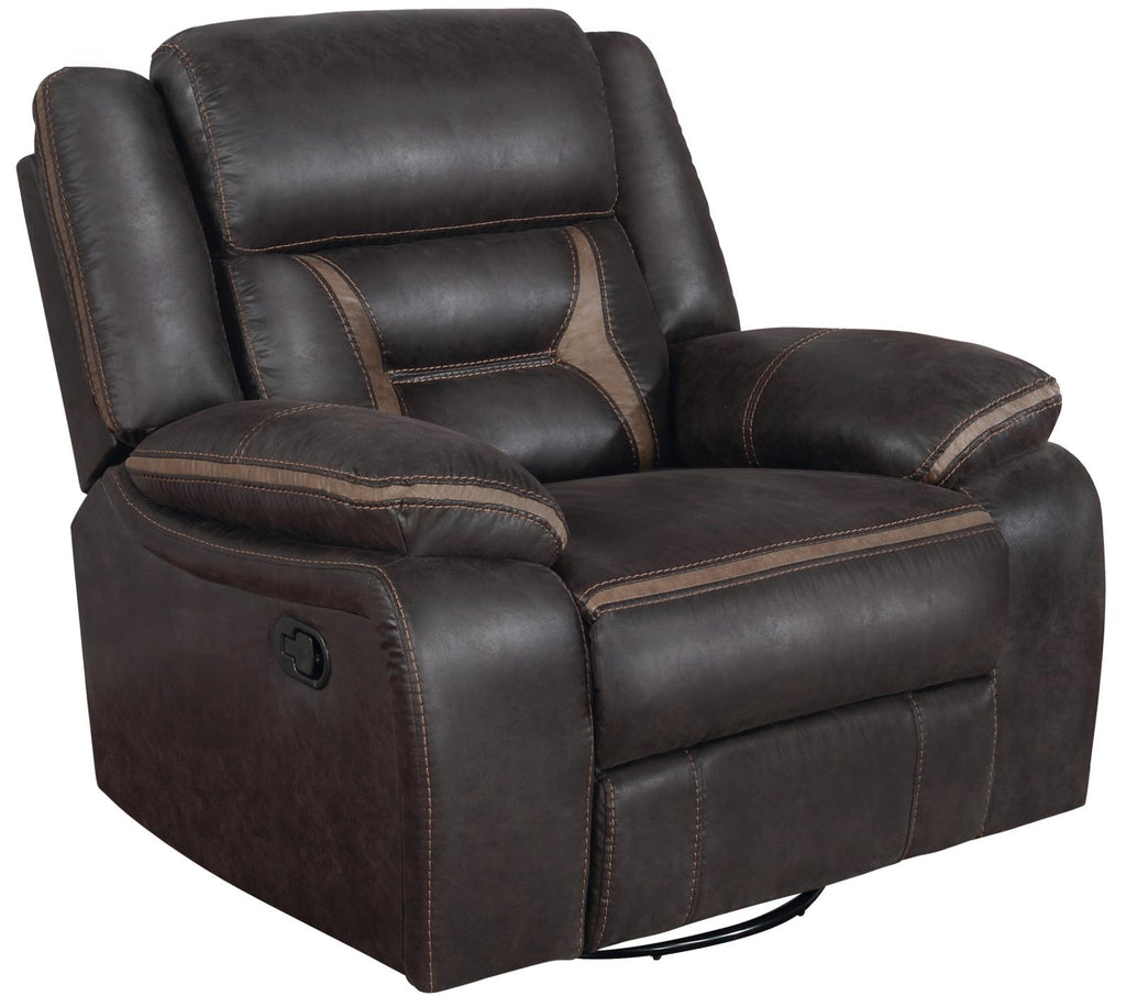 Take this terrific glider recliner and watch it become the favorite seat in your home. Leatherette upholstery adds to its softness and comfort. This glider's aesthetics are enhanced with contrasting stitching that offers more stylish appeal. Pocket coil cushioning and padded armrests make for an extra cozy seating space. Enjoy the smooth gliding motion of this leatherette recliner and feel inspired to rest and relax.