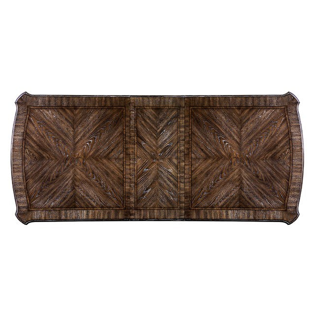 Beautiful wood inlay details and a dramatic trestle base create a grand statement with elegance galore. The ivory fabric upholstery provides a stunning contrast against the rustic natural tone finish for a look that is as cozy as it is chic. Intricate leg designs play beautifully off the delicately cut backs for a look that will inspire and amaze.