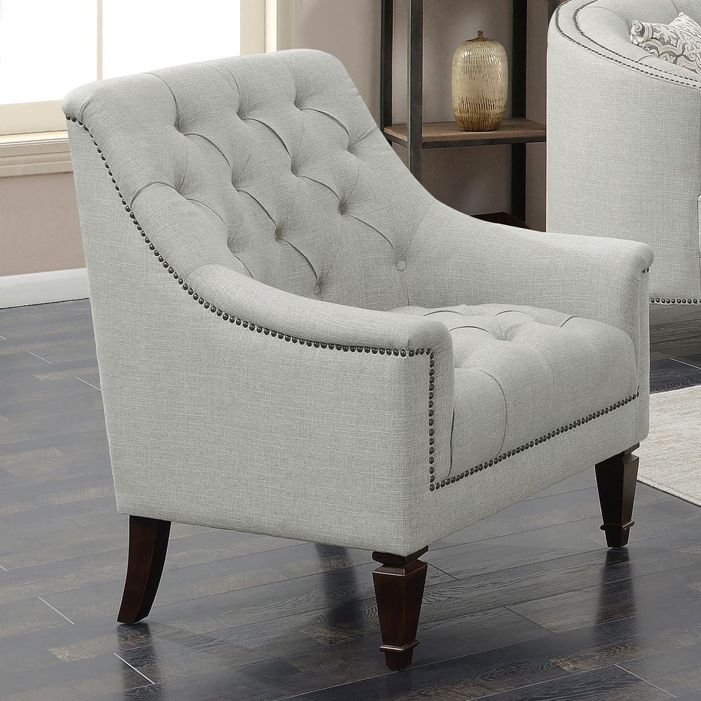 All eyes are on the romantic silhouette of this accent chair. Bolster the tasteful appeal of a transitional room with a beautiful chair with elegant contoured arms. grey upholstery brings a neutral character that blends in most settings. Tufting on its seat and seat back join ornate leg designs. Complete a sophisticated, soft seating group with this fabulous chair.