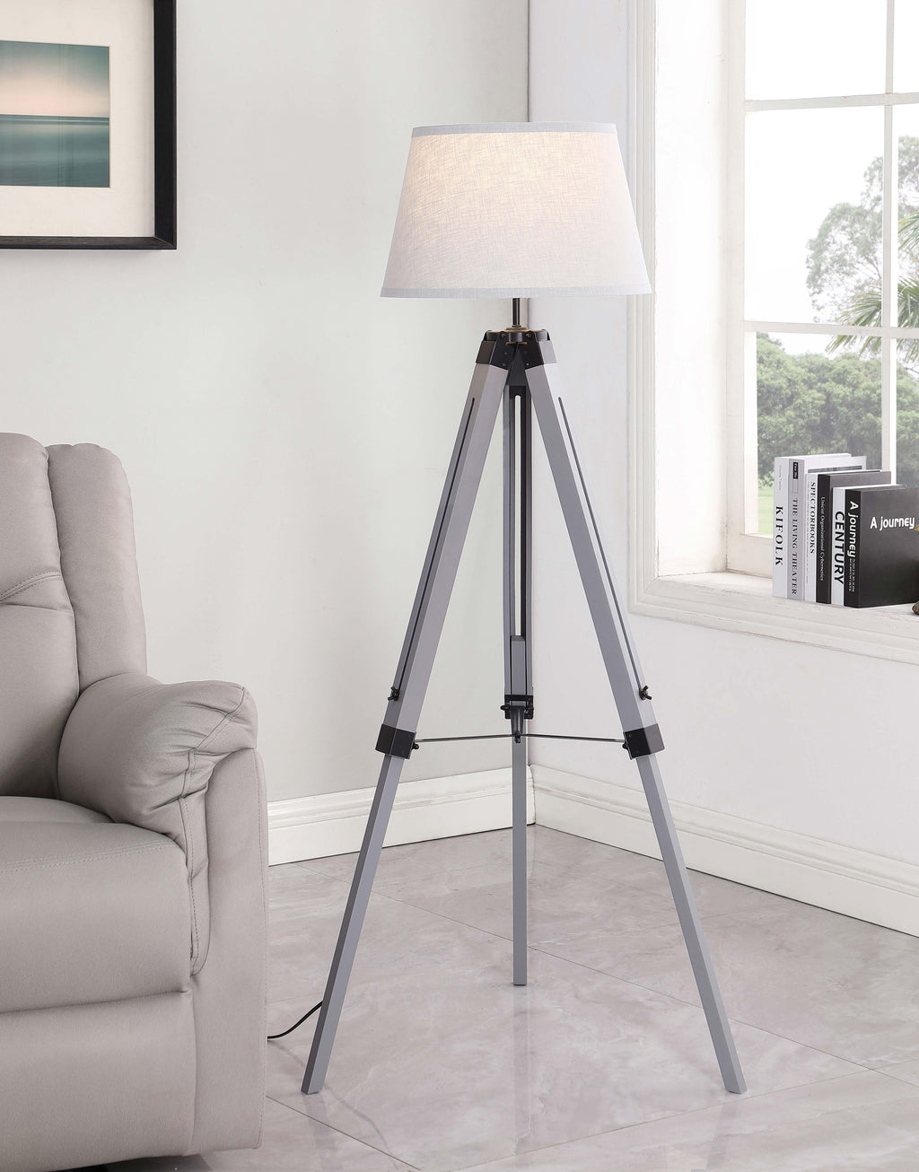 Go modern as you supply ambient lighting in a home office or living space, choosing the Dayton floor lamp to begin a cool look of both studio and contemporary attitudes. This tripod style lamp is perfect for retro design schemes and for upbeat modern settings. A hint of rustic charm comes in a weathered gray wood tripod upper base and extended legs made of metal. This lamp is a bright and cheery addition to a casual room, including a crisp white linen-like tapered drum shade. Operates with a rotary switch located on its socket.