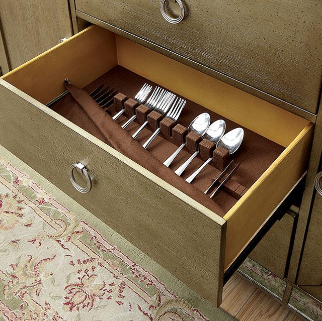 Dine in style with this fabulous Antique Gold finished dining set. Antique mirrors accent the set, adding soft reflections that glimmer in natural light. Cushioned chairs are elegantly detailed with nailhead trim and single tufted accents. Dazzle with the geometrically designed mirror and easily organize dinnerware with the dining server. Intricate and opulent, this dining set provides comfortable seating with an expandable leaf that ensures plenty of space for everyone.