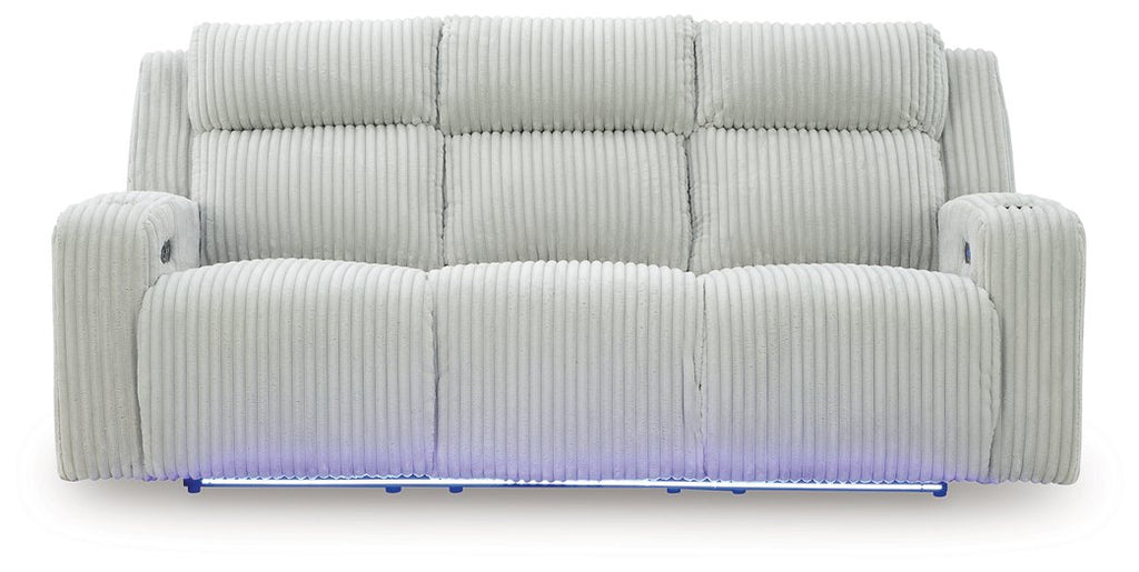 Trend-right style, meet irresistible modern function. Your living room gets a cozy-cool upgrade with this power reclining seating package. Curl up in its ultra-chic corded fabric and recline with one-touch controls. Is it movie night or game time? With ambient LED lighting, this set transforms from a serene relaxation spot to an entertainment hub. USB charging, cup holders and storage cutouts make lounging all the more convenient.