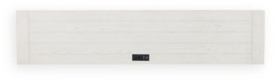 This counter height dining table and barstools set brings an air of casual charm to mealtime. With its antiqued white finish and light gray upholstered seats with nailhead trim, modern farmhouse-style dining has never been so fashionable. Plus the table includes handy USB charging and a power supply. All that's missing is you and your family.
