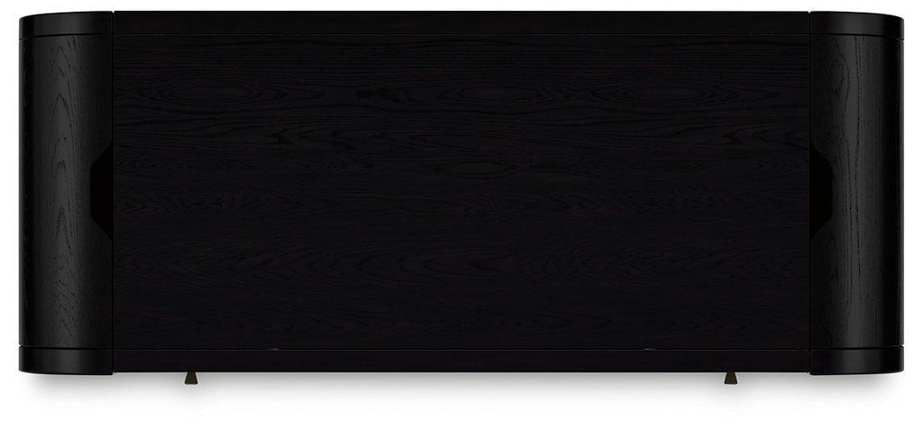 Inspired by art deco design, this softly shaped home office desk makes a lasting impression in a simply stunning way. Its magnificent curved silhouette is enhanced by a rich layered black finish on the textured wood grain surface. Complete with ample storage, a pull-out keyboard tray and USB charging, this is the all-in-one piece you’ve been looking for to elevate your contemporary workspace decor.
