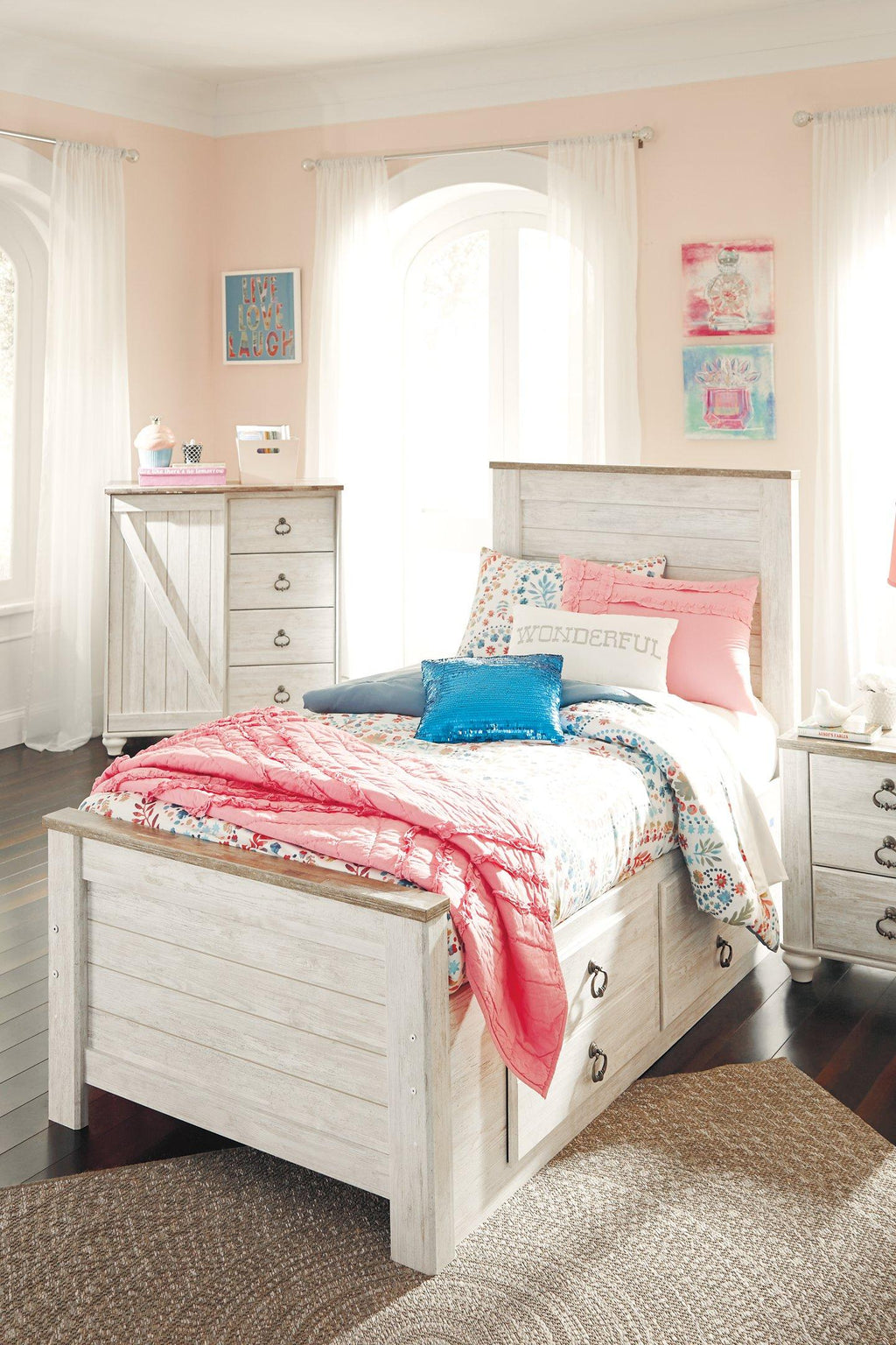 This twin panel bed with storage is the ultimate statement piece for a coastal cottage or shabby chic inspired retreat. Its whitewash finish is wonderfully easy on the eyes. Faux plank cap rails on the headboard and footboard infuse a driftwoody look that has our minds drifting away to beachy-keen escapes. Two smooth-gliding drawers keep linens, blankets and jammies close at hand. Mattresses available, sold separately.